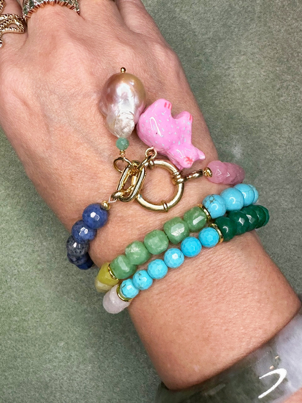 This 22-inch Candy beaded necklace showcases a stunning array of raw cut gemstones, including jasper, opal, pearl, moonstone, and turquoise. The necklace features two unique charms - a hand-painted alebrije bear and a baroque pearl - which can be removed or repositioned along the strand. With its versatile design, this piece can be worn as a necklace or wrapped around the wrist as a bracelet. The gold-plated clasps add a touch of elegance to this colorful and customizable accessory.