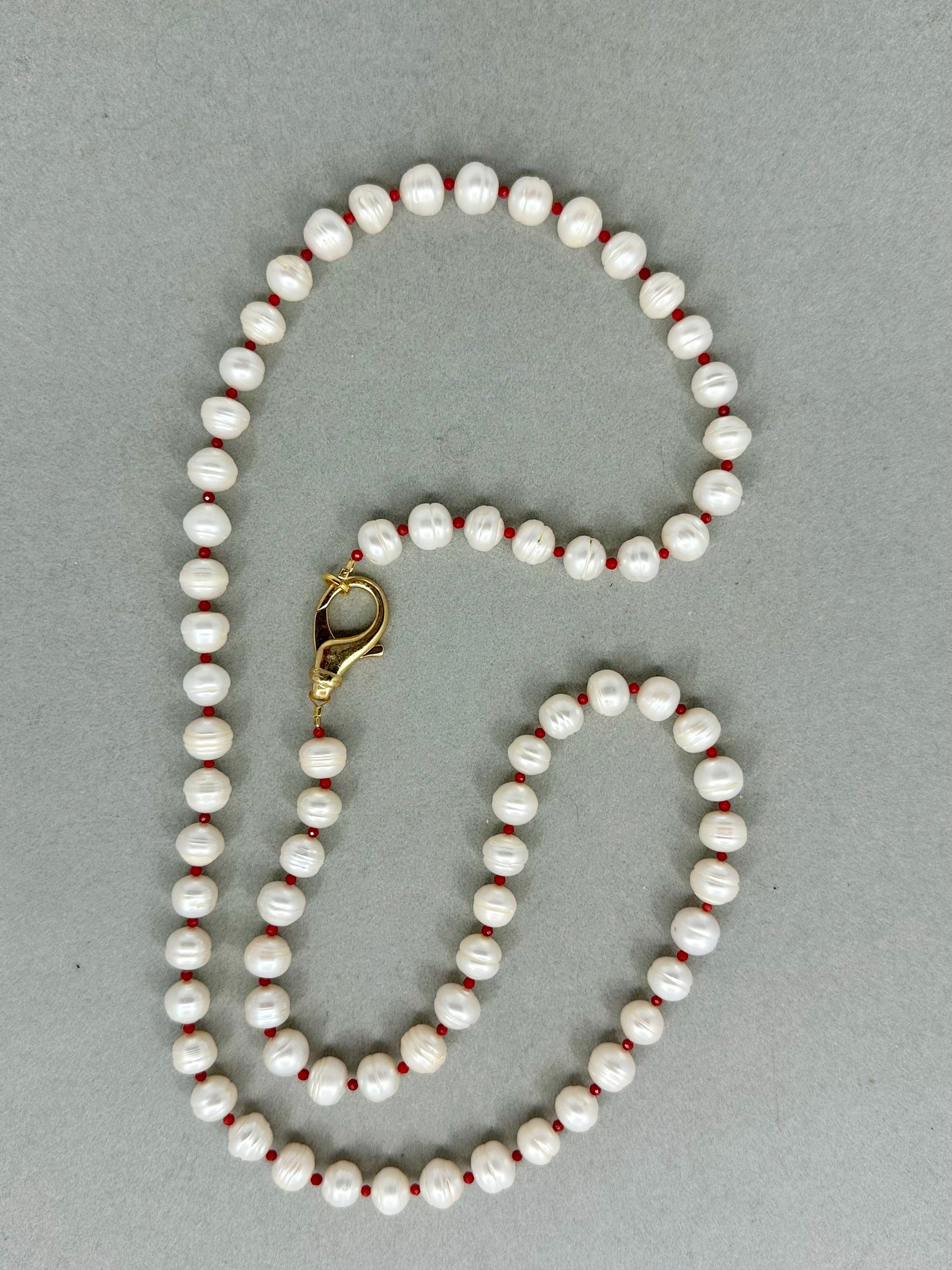 27 inch fresh water pearl and coral necklace. Can also be wrapped around your wrist. Gold plated silver lobster clasp.
