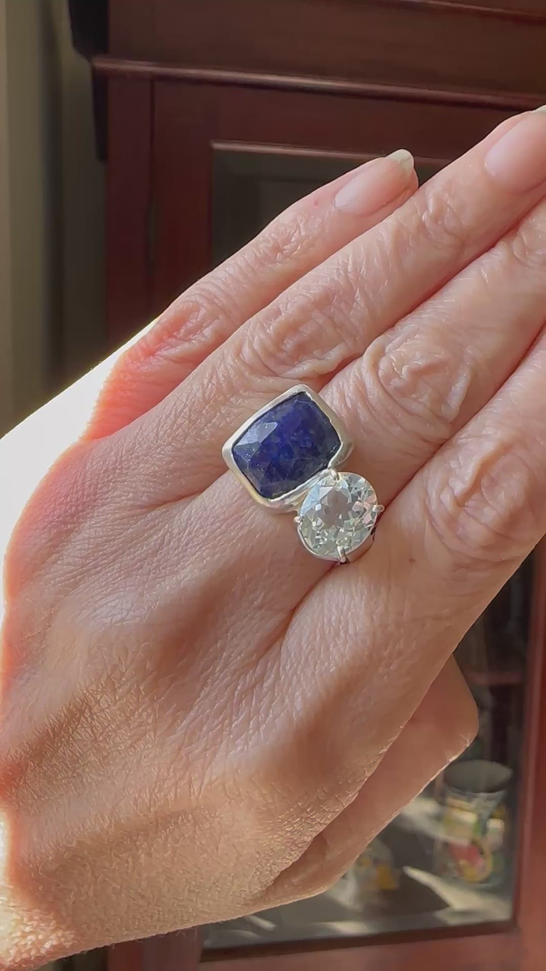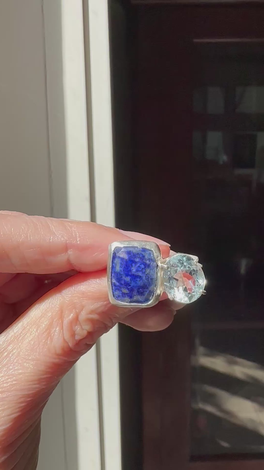 Facet cut Lapis (7.1 ct) and Blue Topaz (4.45 ct) set in fine silver with a satin finish.