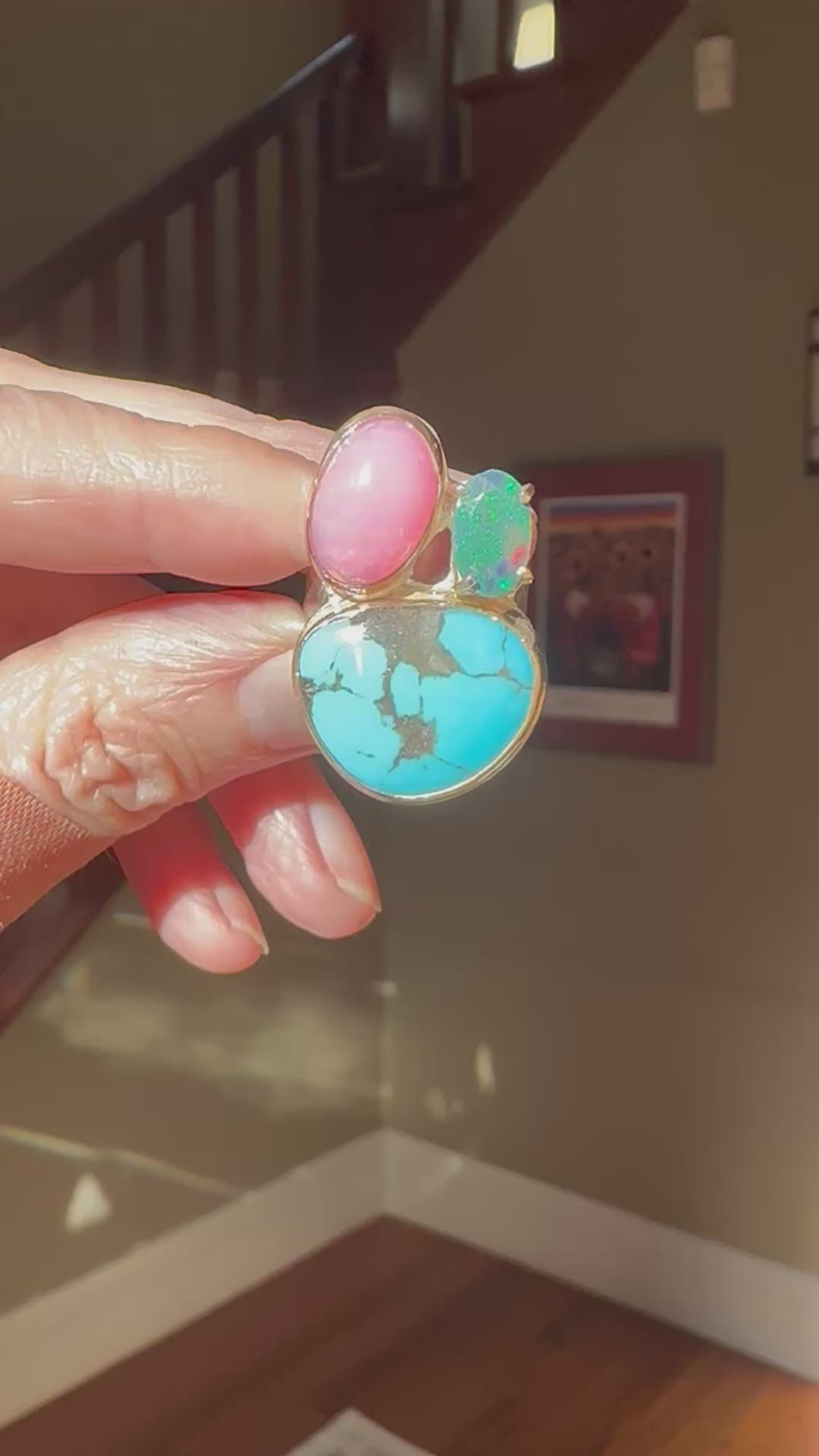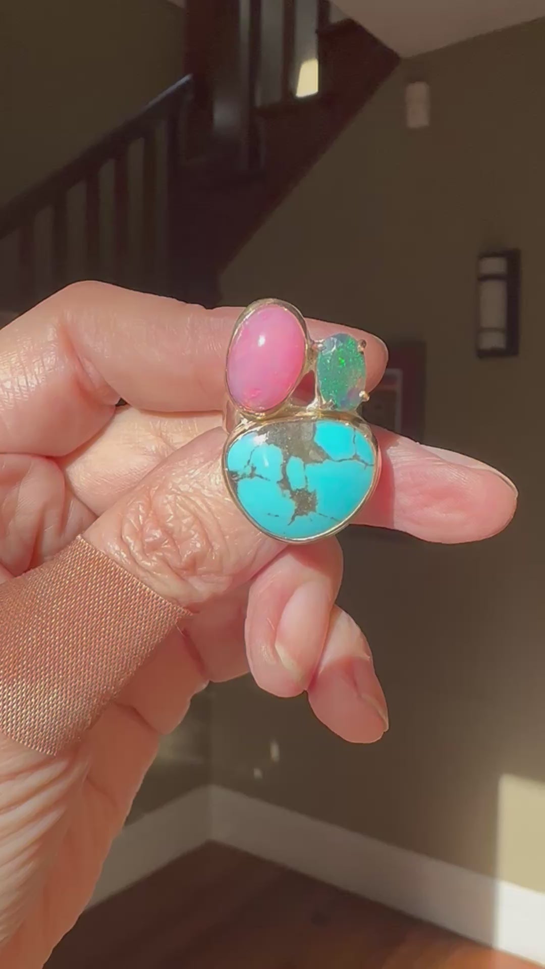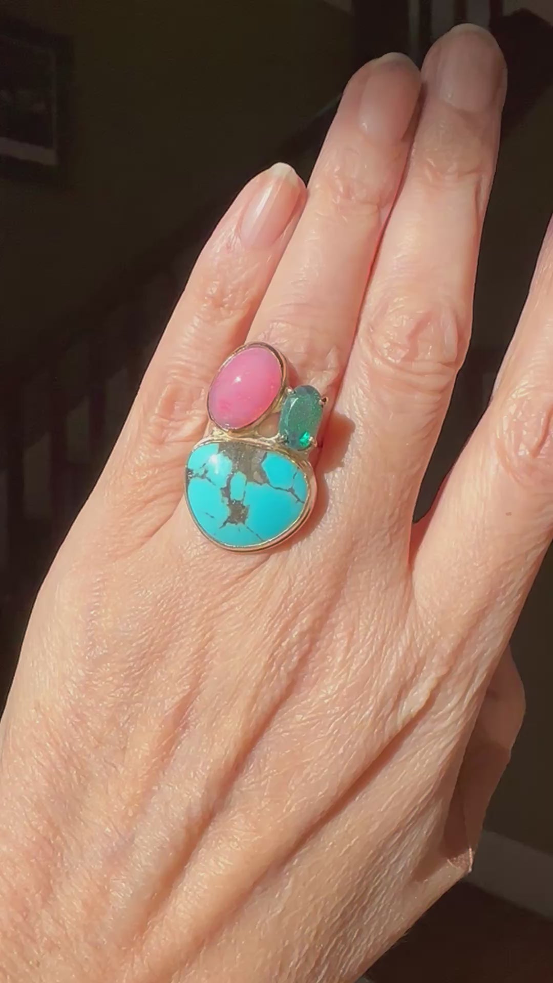 Pink and Green Opals with Turquoise 14k gold and silver ring