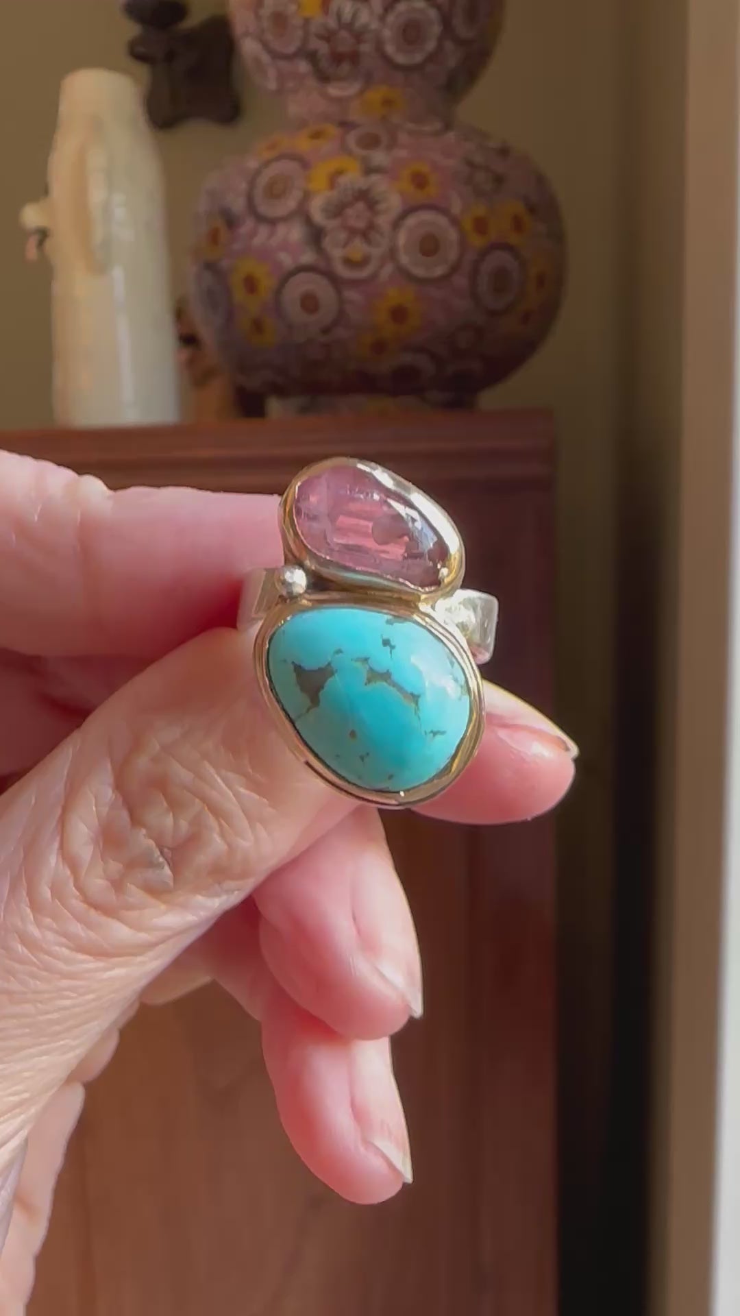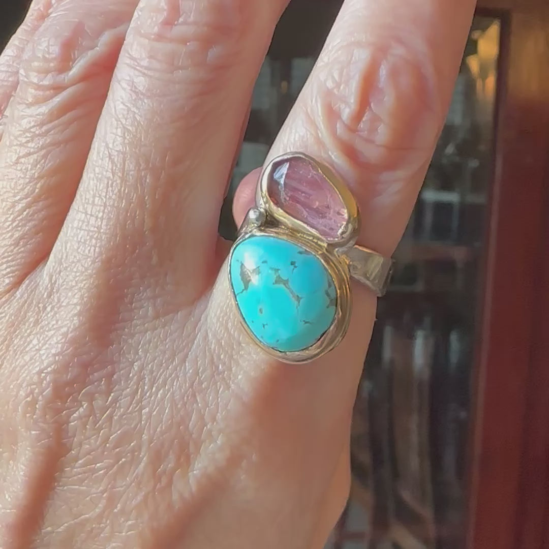Pink Tourmaline and Turquoise Gold and Silver Ring
