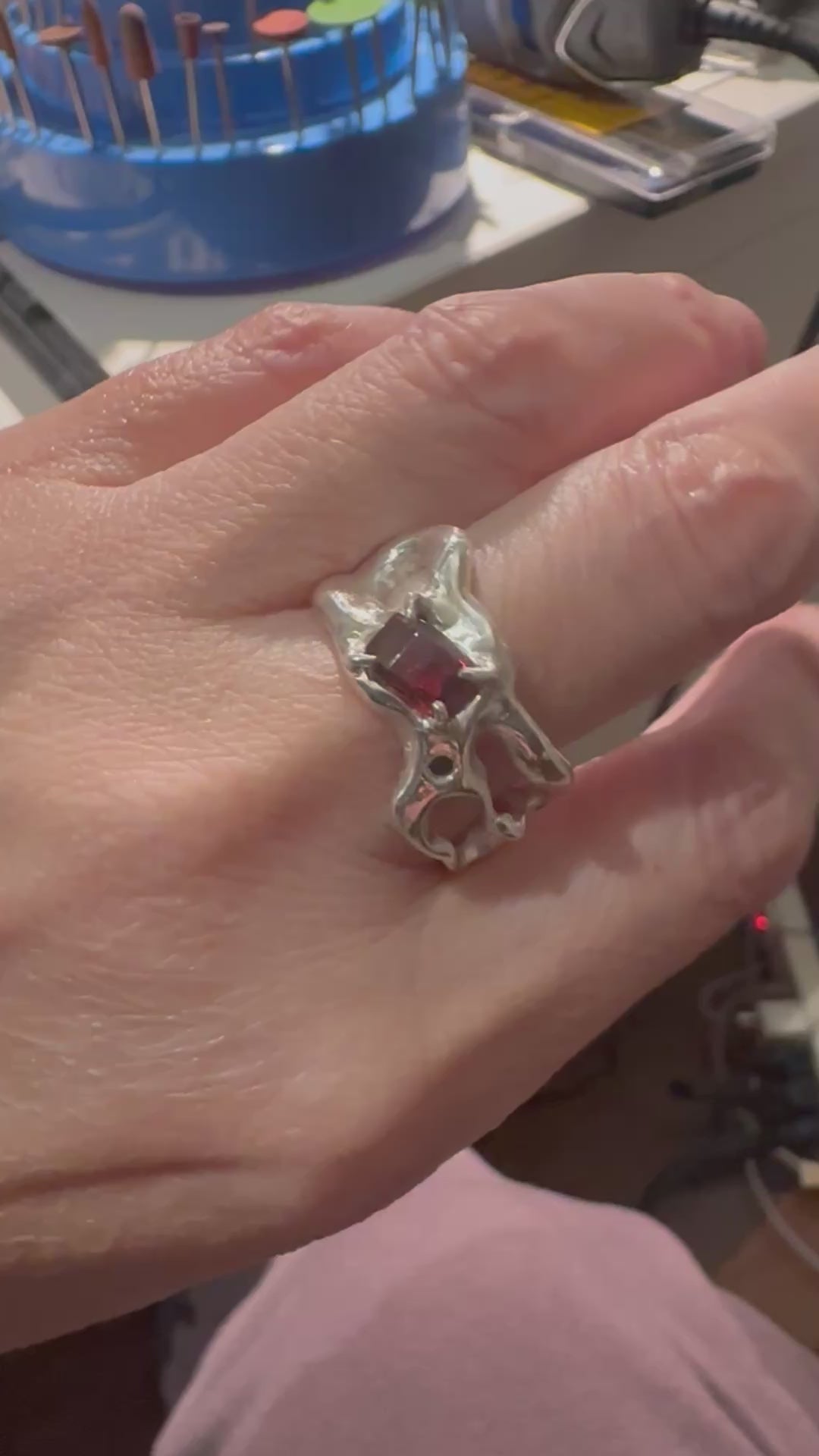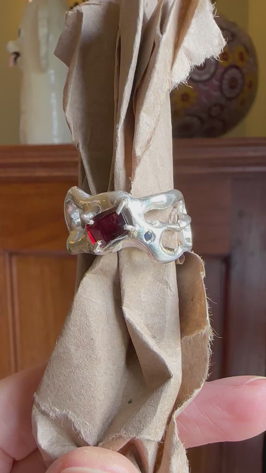 Recycled sterling silver, red garnet, and blue sapphire ring.