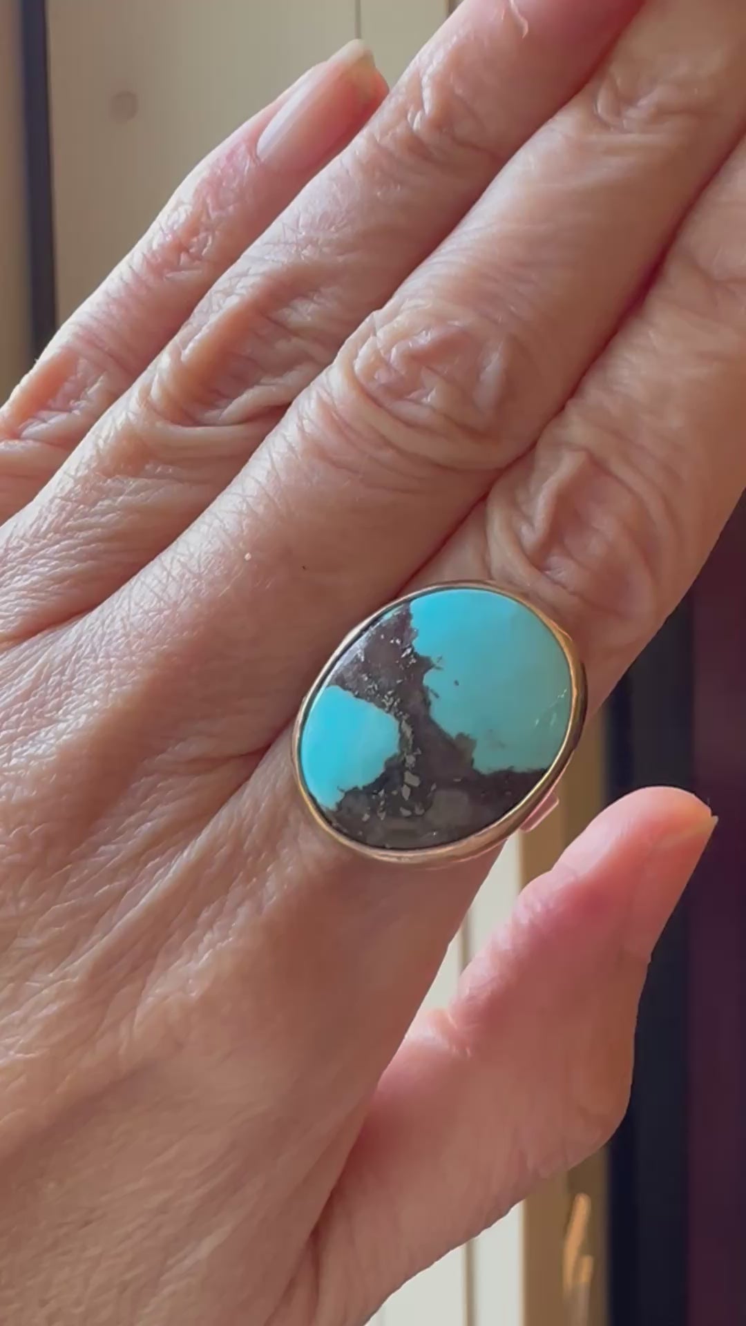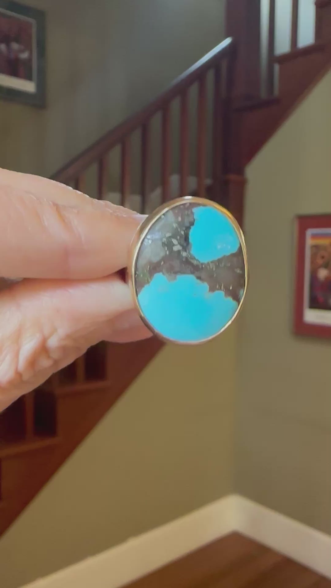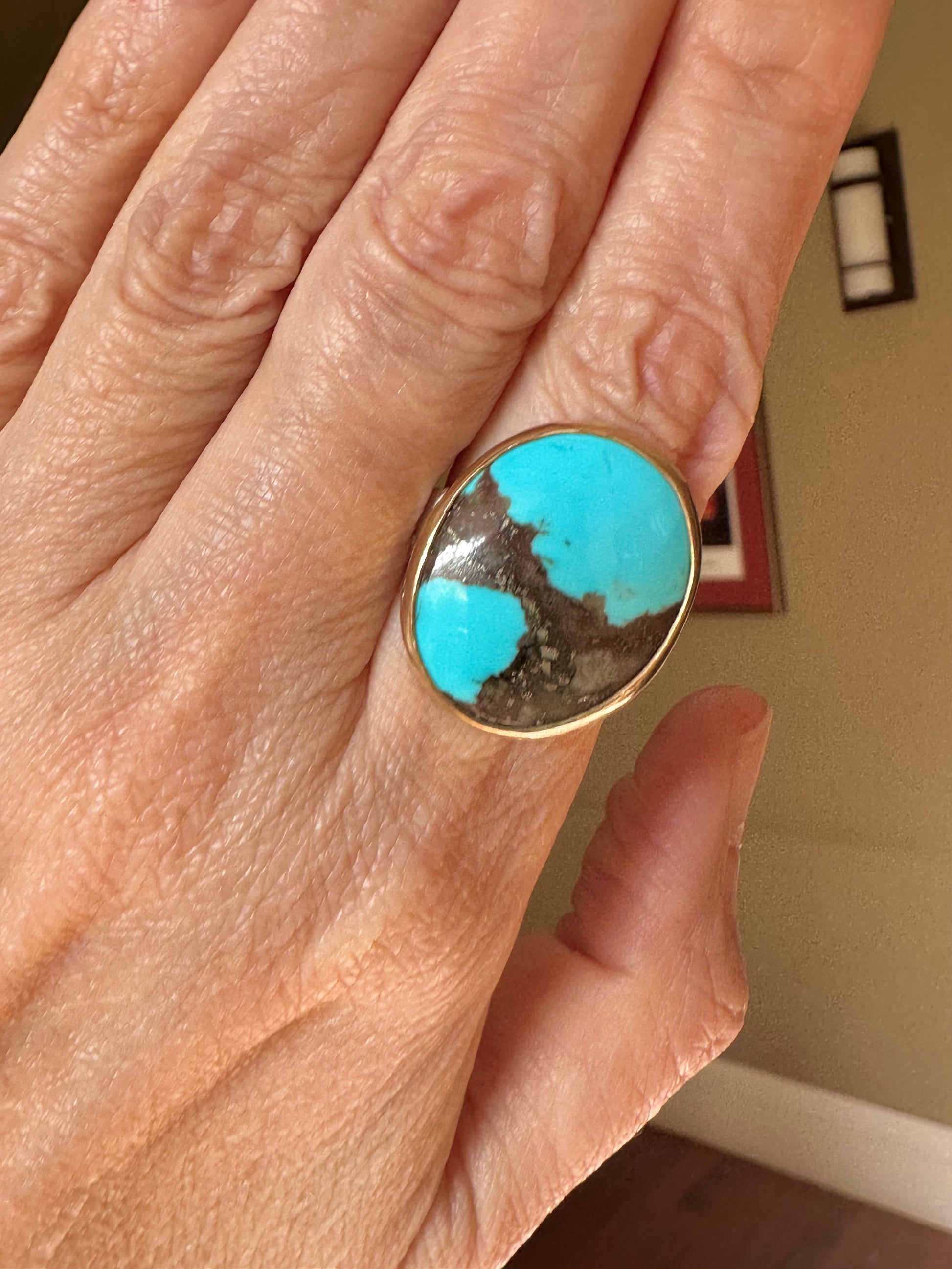 Large Turquoise in a 14k gold bezel set in fine silver.