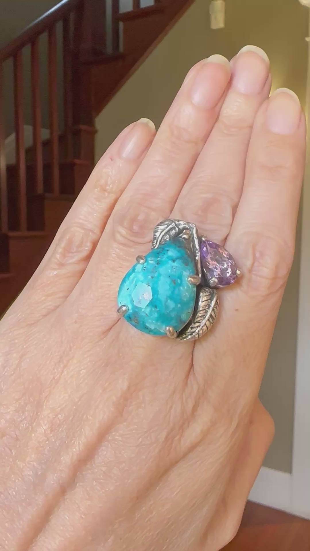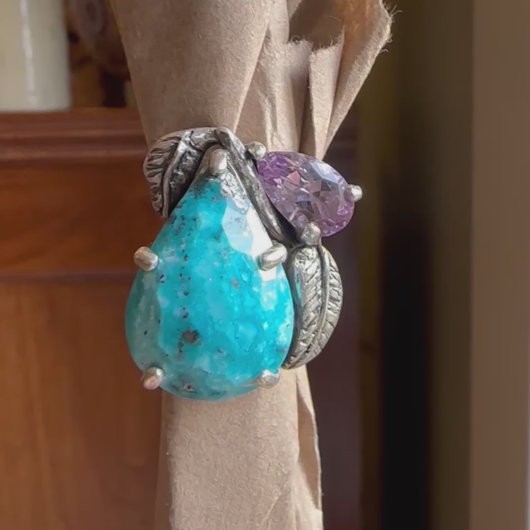 Persian Turquoise, Amethyst, and fine silver leaves set on recycled sterling silver.